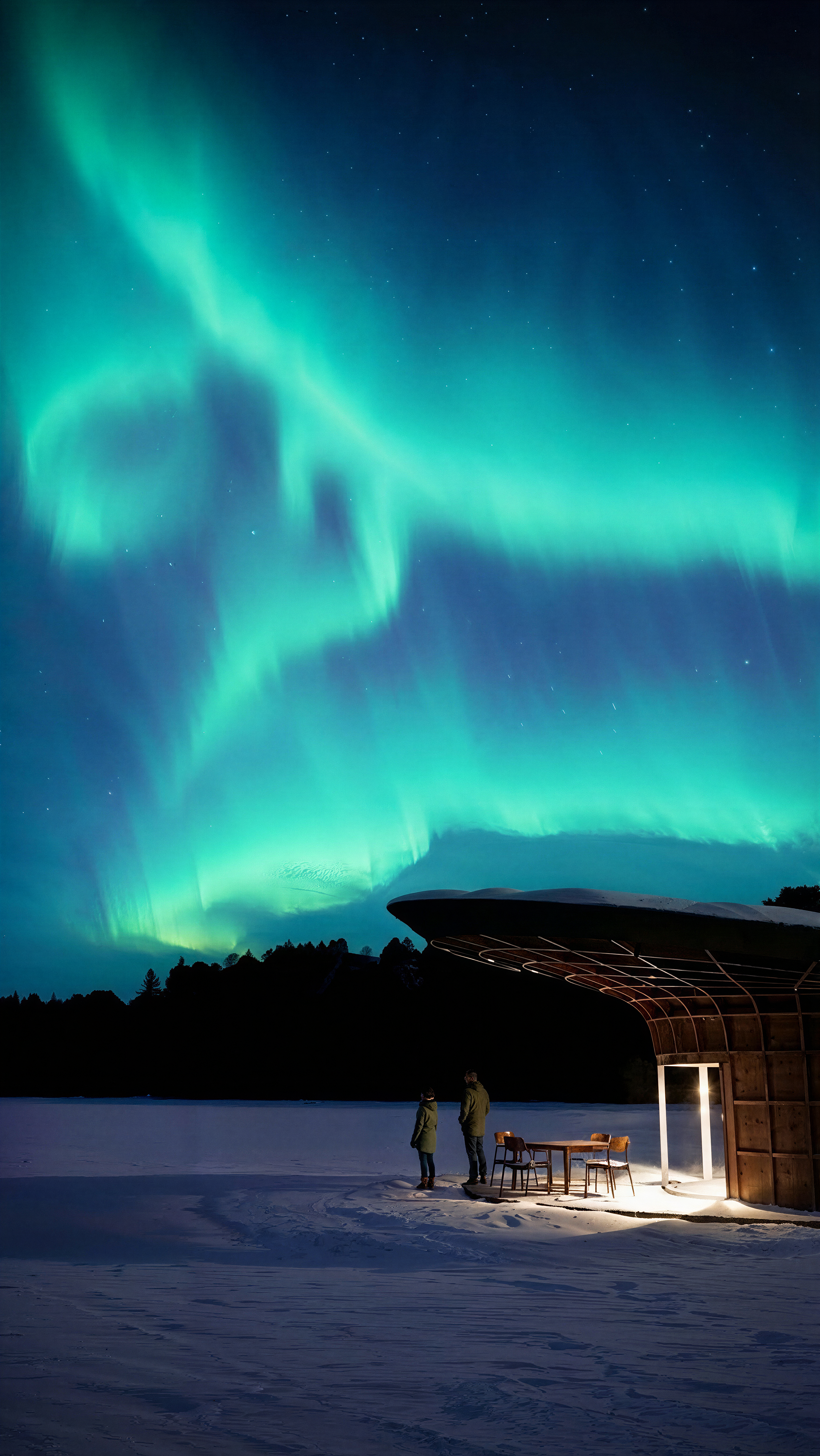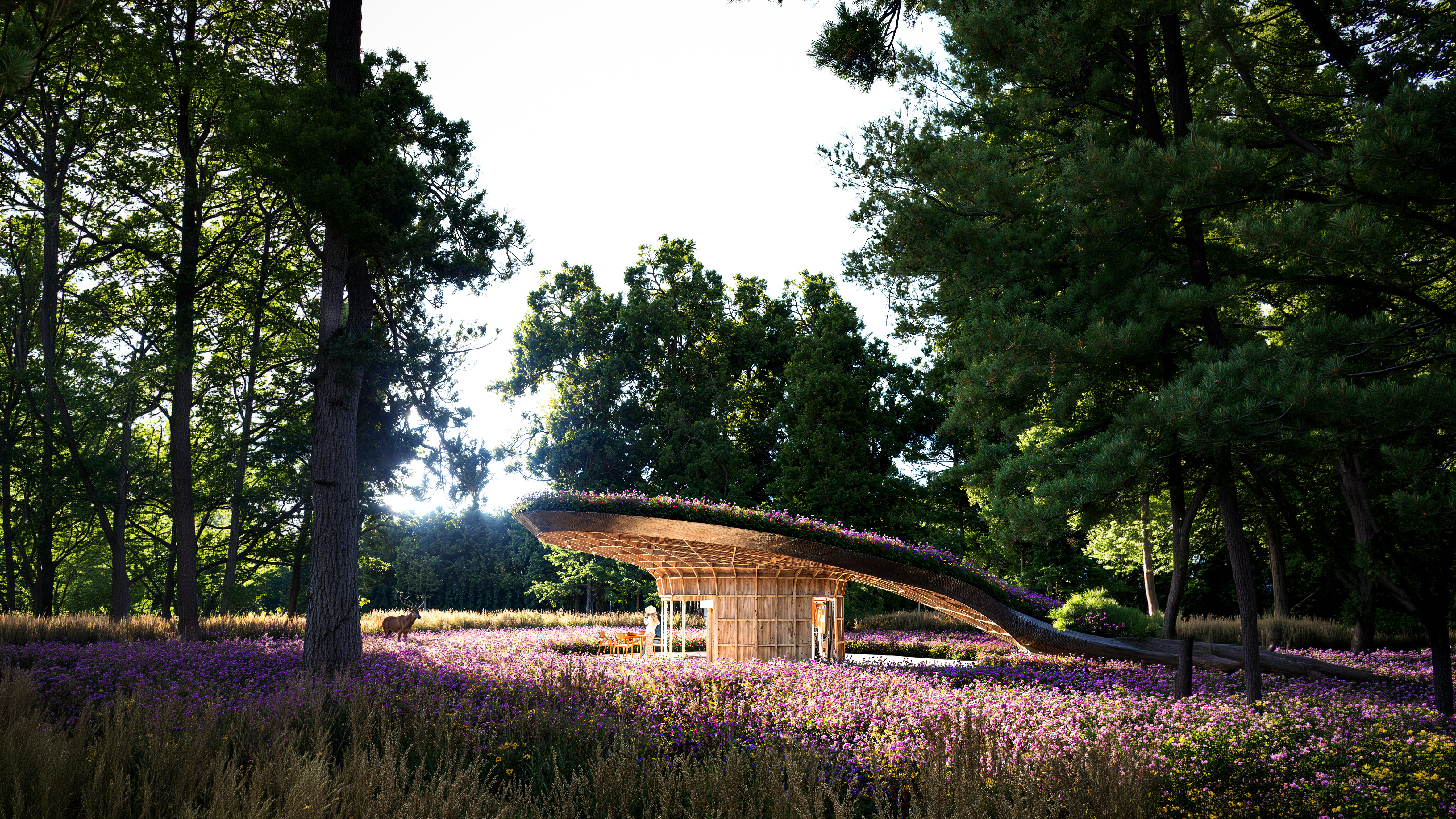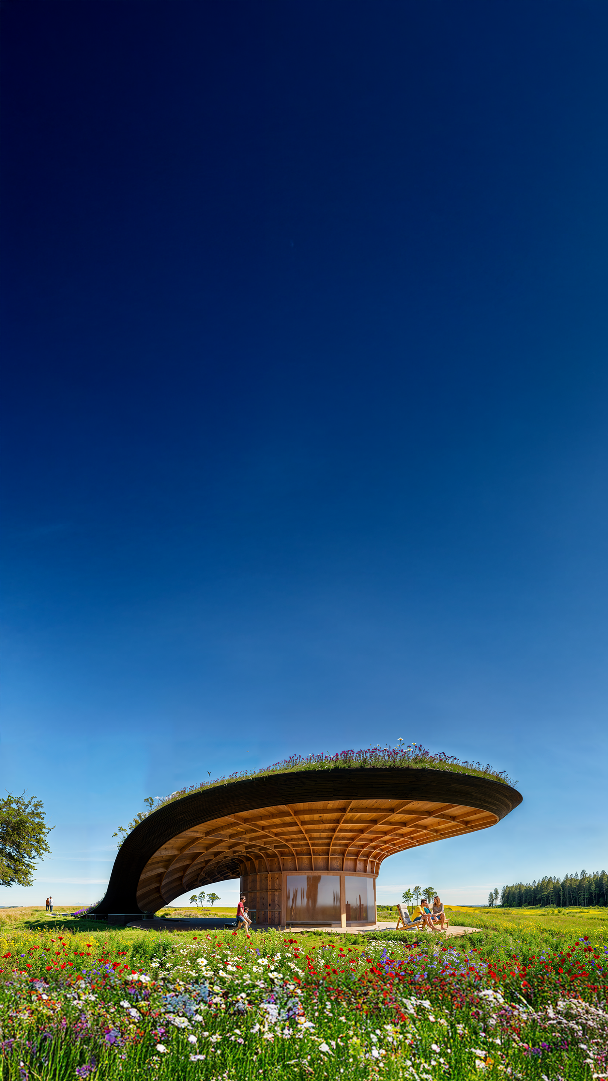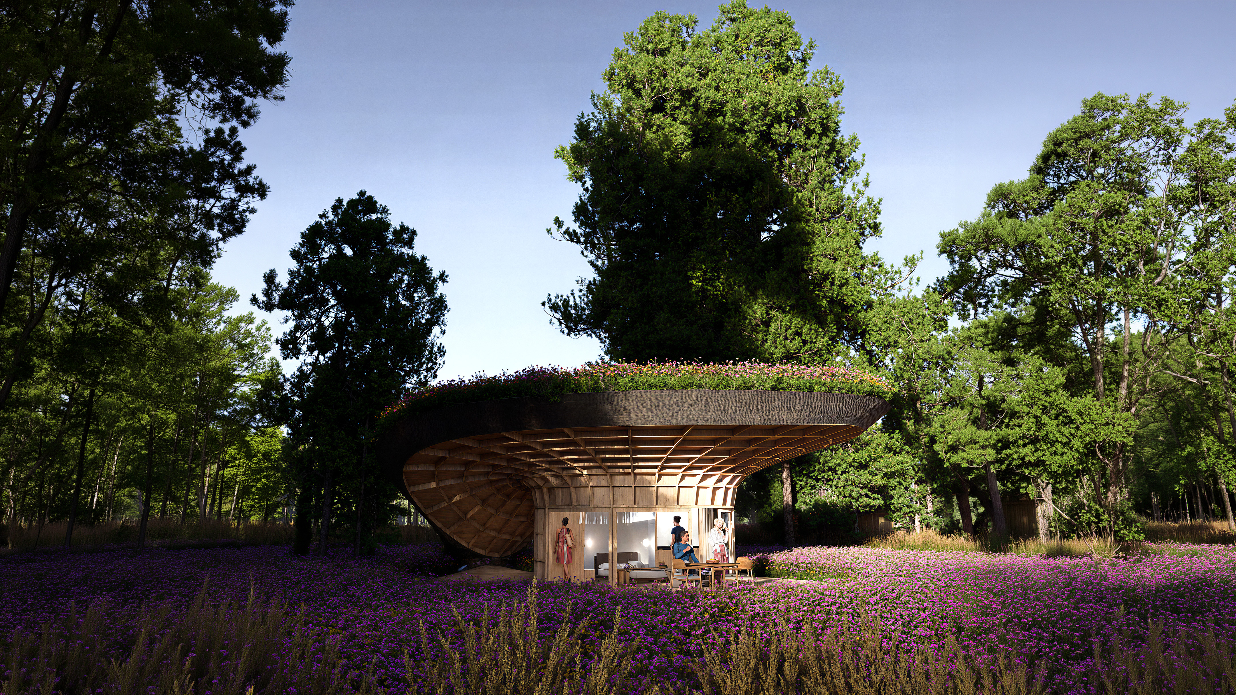 Engineered to dissolve into the landscape, the cabin visually vanishes from sight when approached from a distance. Drawing formal inspiration from the morphology of a mushroom, the structure features a sweeping, extended canopy. This primary architectural gesture protects a continuous wraparound terrace, allowing the exterior spaces to be inhabited year-round, shielded from heavy winter snows and intense summer sun.