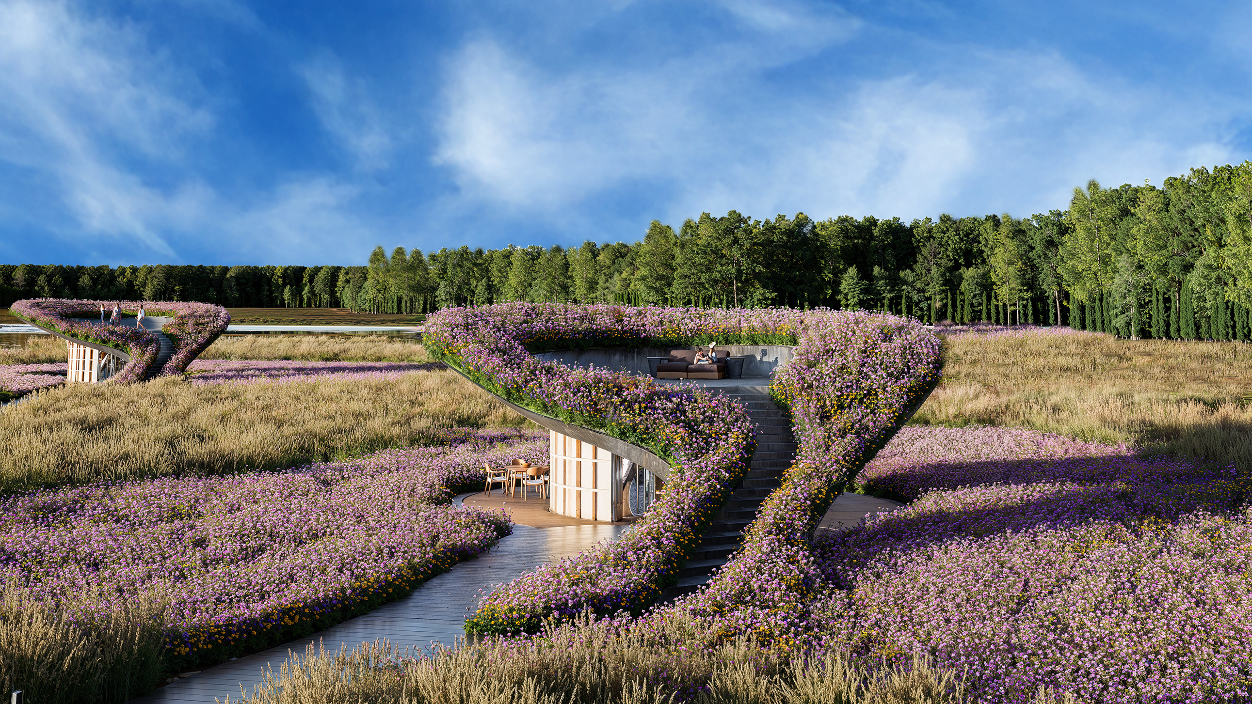 Where the canopy peels up from the terrain, it reveals a roof garden and elevated terrace, simultaneously serving as the very element that conceals the structure from external vantage points. From the integration of raw, natural materials to the expansive panoramic sliding glass systems, every design decision reinforces the continuous merging of the interior sanctuary with the untamed landscape beyond.